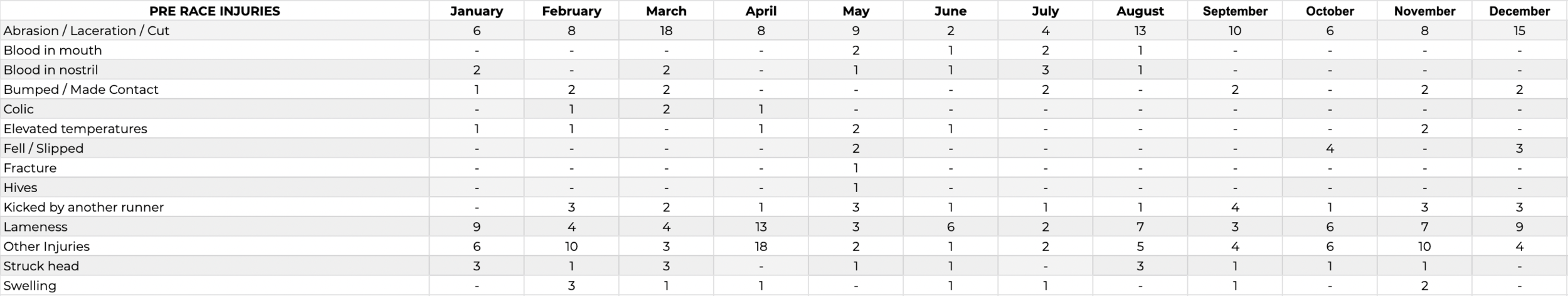 Before they even enter the race, horses can sustain one or more injuries or display signs of an illness. This can be due to training, transport, or pre-race stress.