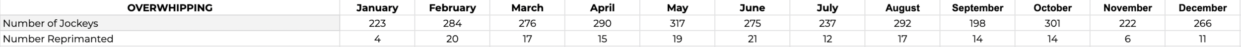 The Stewards record the names of jockeys who have “exceeded the permitted strikes of the whip prior to the 100m under AR132(7)(a)(ii)”.
