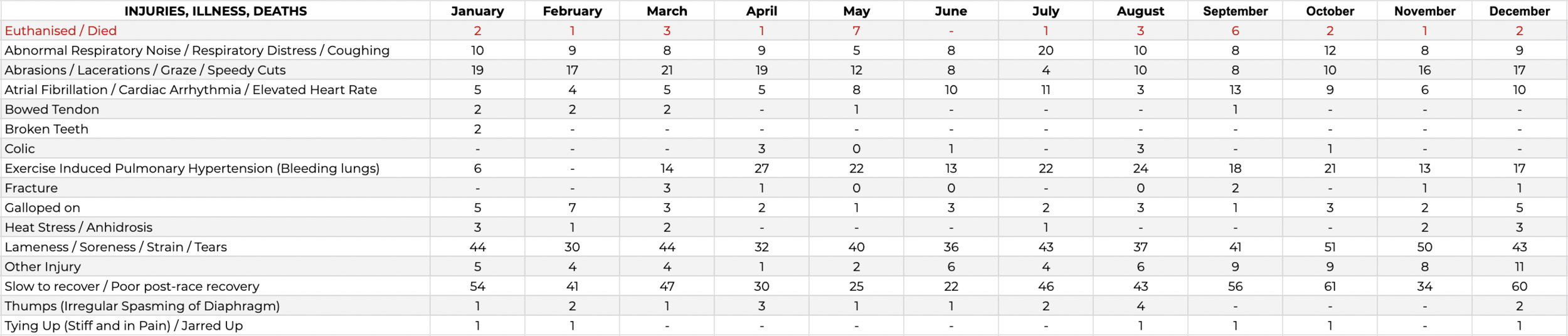 In 11 months of racing, 1,507 horses sustained one or more injuries while running on NSW tracks.